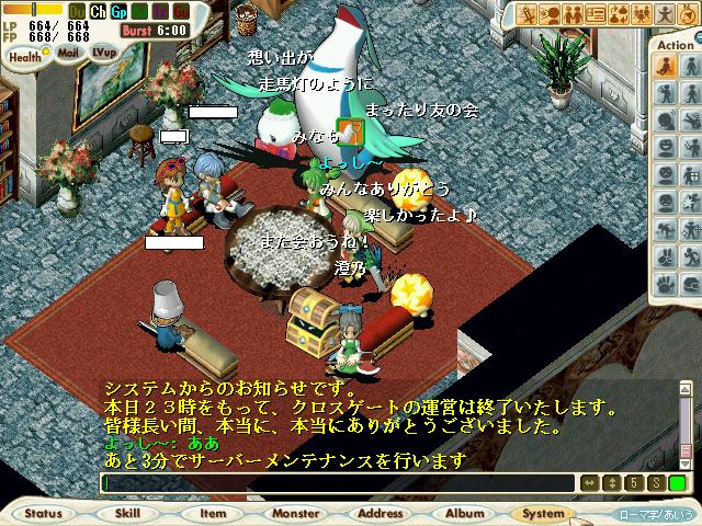 終わってしまった・・・ あぁ・・・泣きそう・・・ まったり友の会 溜まり場、もとい「またり場」です いつもこの場所でみんなを待ってました^^ イールです コンチェでもお馴染み(?)の漁業の町ですw ここからアケルファ地方、コーラル地方に船で移動できるんでしたね セラルカです コレもコンチェではありますね ・・・ただ辿り着くまでの敵がアレですが・・・ XGはそんなことはなくて低レベルでも全然辿り着けます 職人の街、ということでここで職人に就職可能です 私の杖職人よっし~はここから誕生したのでした・・・ アリュートです 蘇生魔法「リヴァイブ」が習得可能で誰もがお世話になります ここを通る時の「オズナグ」ってボスが 序盤のキャラ泣かせでしたね・・・ ウィルノアです ランクアップクエスト1 通称「長老」で訪れます 全体魔法を初めて味わったなぁ・・・ キリです ウィルノア ~ キリに行くのにも「オズニック」が邪魔をします アレも強いんだ・・・ ここでは主にクエスト関係 伝説のルビ様と戦えるのもココのクエストです ガルーナです 周りは砂漠~と必ずRPGに1つはあるような砂漠の町です ランクアップクエスト2でしかあまり訪れる事は・・・ あまり好き好んでいく街じゃなかったですね^^; ジェノーバです 何気に一番よく使った街かも・・・ クエストにしろ、Lv上げにしろ、スキル上げにしろ・・・ 街自体はなんてことないのですがこの付近には面白いスポット(?)が沢山です アルパネスです 雪国らしく雪で覆われているステキな町です・・・が 序盤はただの通過ポイントです・・・ 回復に寄ることが一番多かったかな 魔術大学です アルパネスの先にある街・・・とはちょっと違いますが建物です この付近でよくLv上げをしたものです 「大学Lv上げ@3」 「雪山Lv上げ@4」 う~ん、懐かしい看板です そしてはじめの街ファンブルグです ん?ティナ? SS取ろうと思ったけど昼間しかワープG使えないの忘れてて時間切れでしたw 皆との出会いの場所です そして仲良くなった人たちと作ったギルドが「まったり友の会」 ギルドというより「仲良しグループ」をテーマにウン年間・・・ 私の通常露店スタイルです いつも6鯖の東病院付近で露店してました ただコンビニのように売るんじゃなくて 八百屋さんのようにいろんなおしゃべりを加えながら売るのが楽しかったです 元またり場です 実はこの倉庫の中がはじめの溜まり場でした 知ってる人は古くからのメンバーだけかと 倉庫の中です クエストで後ろの兵士に話しかけるため人通りが多かったので 今の大聖堂に移動しました 多いって言っても1週間に1回あるぐらいですけどねw この兵士が必要な「忍者クエ」がクロスゲート1,2位を争う感動するクエストで 話せば長くなるんですけど・・・ ラストの墓のシーンで起こるたった一つの言葉が・・・ あ、涙出てきた"(ノ_・、)" 終了間際3分前の状態です 残念ながらギルメン全員集合!はならず・・・ 一番悔いが残ったのがギルメン皆と会えなかったことです(;´д` ) 哀しいシステムからのメッセージとともに終わるクロスゲート 思い返せばどんどん色んな思い出が蘇ります その思い出にいつもいるのがギルドや仲良しメンバーでした・・・ 私と遊んでくれた皆さん 本当にありがとうございました PR