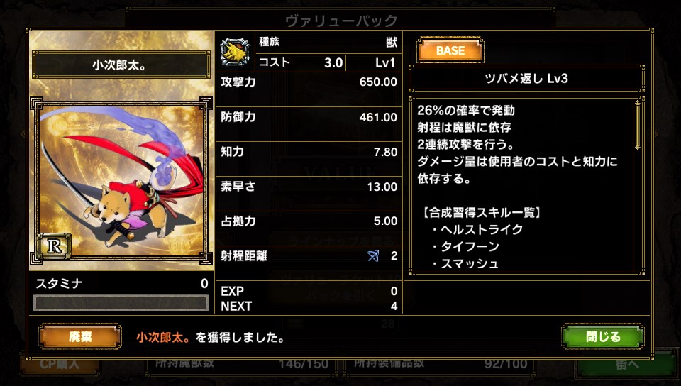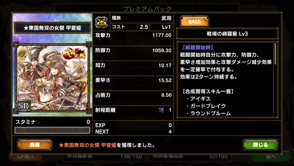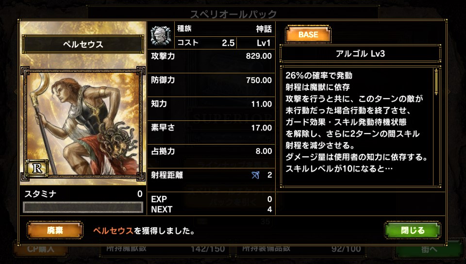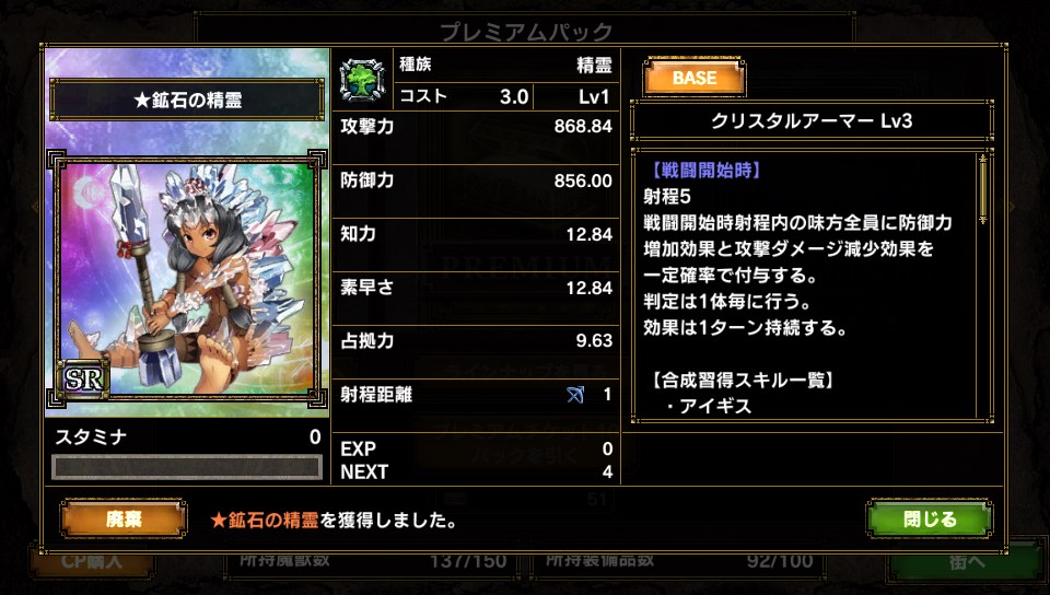 プレミアムチケット*61枚 スペリオール*35枚 ヴァリュー*38枚 という結果でした(満足 で、開封の結果 ・SR ★クリムゾンヘルナイト ・SR ★鉱石の精霊 ・SR ★東国無双の女傑 甲斐姫 ・SR ★シャルルマーニュ ・SR ★オークチーフ ・R ★ミノタウロスサージェント ・R ペルセウス ・SR ガープ ・SR シャルルマーニュ ・R 淀君 ・R 小次郎太。 ・SR 龍族のクリスタル 特筆すべきはやはりシャルルマーニュの多さ・・・ではなくて 鉱石の精霊ちゃんキター 凶悪スキルクリスタルアーマーですよ! (ゲイルアーマーに奪われつつあるけど・・・ ただ精霊・・・かぁ・・・ ロクなのいないや(泣き ななななんじゃこりゃー お前は本当にコスト2.5か?3.5の間違いじゃないのか と思うぐらい基本ステータスとスキルが胡散臭いユニットです よし、使おう(確信 あとはまぁ初の裸族・・・もとい神話族だったり 今のところは「100%使用しない」のでオークション行です・・・ 獣族という足だけがとりえの中いい仕事をする(と噂の 小次郎太。君とか こんなところですね さて、終盤のユニットを今から考えなきゃなぁ ん?スタートダッシュユニット? そりゃ前シーズンから継続で★バンダースナッチさんですが何か? PR