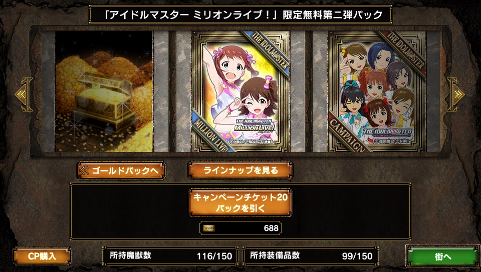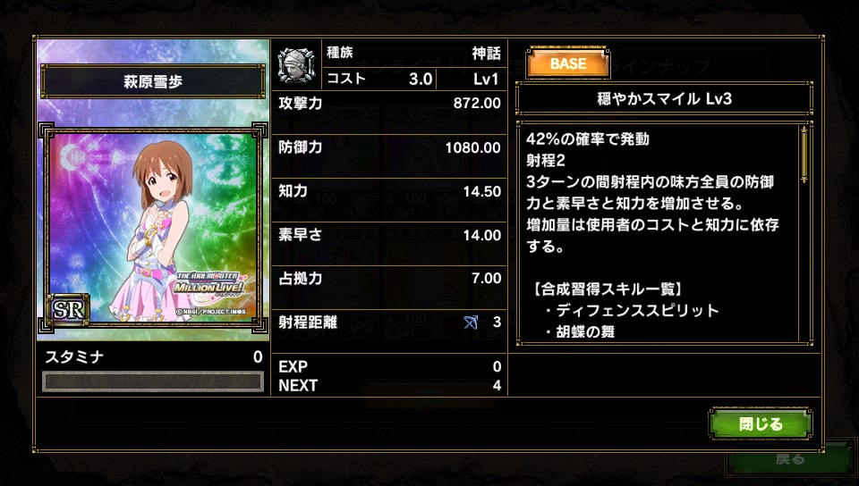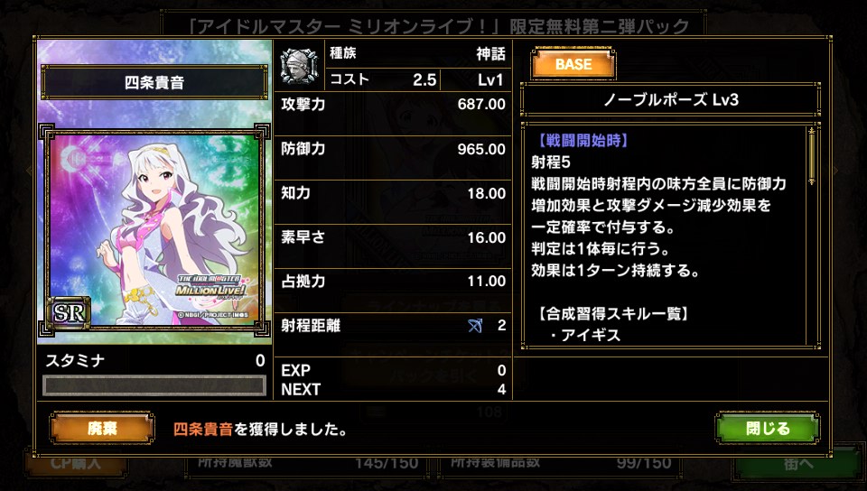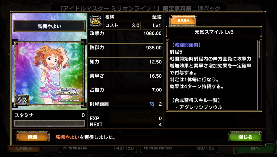 4thシーズンではスタートダッシュに失敗してしまい 兵力蓄えで時間を使ってしまいました。 最初コケるとシーズンのやる気失うよね、と誰かが言っていたのを 確かに実感しているのですが とうとうきました アイマス ミリオンライブパッケージ第2弾が そのために貯めていたアイマスチケットが火を噴きます! 結果は・・・ 輝くアイマスチケット(約700枚) なぜこんなに貯めていたのか それは雪歩狙いだったからさー! パチスロRT中のkosmos,cosmasが妙に気に入ってしまい それ以降アイマスの中で選ぶとしたら?は雪歩!になっております。 第一弾では残念ながら姿を見なかったので このひと月の間ひたすら貯めていたのです 狙いは雪歩! って・・・アレ?神話族? orz やる気Down... まぁいいや、気を取り直してGOGO! R 篠宮可憐 * 3 UC 箱崎星梨花 UC 福田のり子 * 2 UC ロコ × 4 R 周防桃子 UC 徳川まつり * 3 UC 高山紗代子 * 3 UC 望月杏奈 × 2 R 二階堂千鶴 * 3 UC 徳川風花 UC 真壁瑞希 * 2 UC ジュリア * 2 R 北上麗花 * 3 UC 佐竹美奈子 * 2 SR 高槻やよい SR 四条貴音 やよいキター(*'ω'*) 貴音キター\(゜ロ\)(/ロ゜)/ けど神話族・・・ 半分開けた時点でミリオンライブのキャラしか出ていないときは 殺意に目覚めてしまいましたが なんとか収穫アリです。 ただ・・・無課金でプロモカードのスキル上げは辛いんだよなぁ・・・ やよい武将だし使いたいけど・・・ PR
