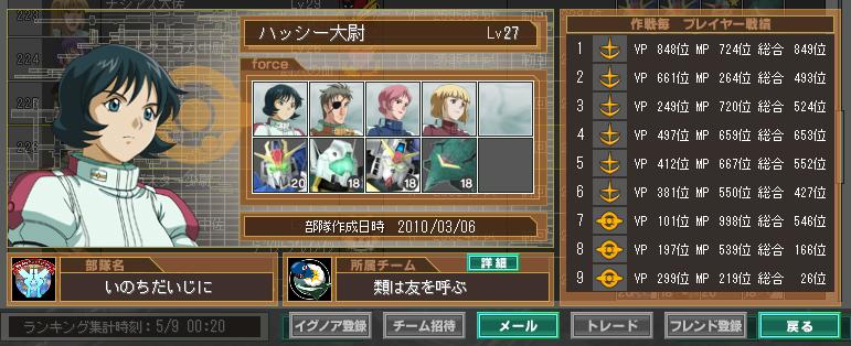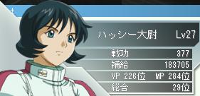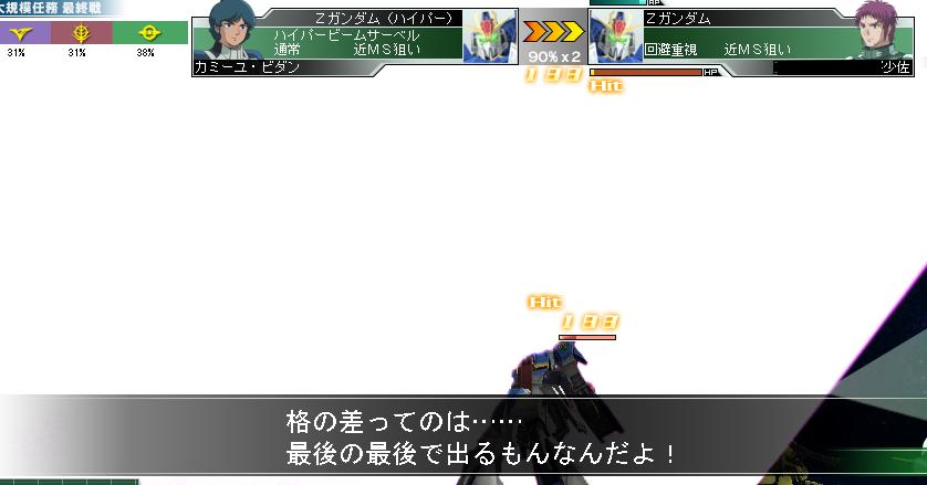 結果は・・・ カミーユ【Zガンダム(ハイパー)】 謎のバリアー Bio Fieldによってダメージ減少に加え盾防御もありと鉄壁 今回はエゥーゴvsティターンズvsアクシズとなっており3者の代表者はそれぞれ特徴があり 鉄壁・ハイパービームサーベルの暴走カミーユ(と、オマケのクワトロ) 2回行動・隠し腕のシロッコ(と、オマケのレコア) 命中のハマーン(と、オマケのラカン) という感じです 途中からカミーユ君が暴走し、ハイパービームサーベルをぶぃぶぃ振り回すのですが テラ長いビームサーベル すげぇぇぇ・・・・ ちょ、それ味方 と、まぁ色々ありまして結果は アクシズ勝利 orz この歴史の後どうなっていくのか気になりますが・・・ 第1クールはこれにて終戦を迎え第2クールの始まりです 第2クールはジオンでやろうかなーと思っていたら 「初期陣営は変更できません」 orz 来期は連邦→ティターンズと移ろうかな・・・ 第2クールは隊長をネタでもありロマンとも言われる後衛射撃にしてみようかなと思います ・・・あまりに酷かったら途中から路線戻しますが・・・ ちなみにはっし~の第1クール成績 履歴と 最終戦 少尉→大尉まで・・・頑張ったなぁ(笑 PR